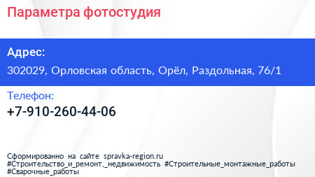 Параметра, фотостудия по адресу 302029, Орловская область, Орёл, Раздольная, 76/1 в дальнейшем Организация, размещена в следующих категориях: