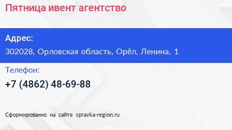 Пятница, ивент-агентство по адресу 302028, Орловская область, Орёл, Ленина, 1 в дальнейшем Организация, размещена в следующих категориях: