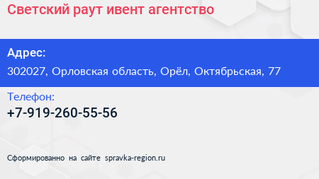 Светский раут, ивент-агентство по адресу 302027, Орловская область, Орёл, Октябрьская, 77 в дальнейшем Организация, размещена в следующих категориях: