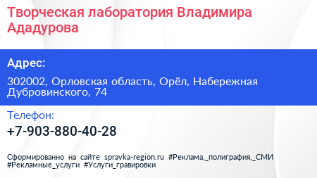 Творческая лаборатория Владимира Ададурова по адресу 302002, Орловская область, Орёл, Набережная Дубровинского, 74 в дальнейшем Организация, размещена в следующих категориях: