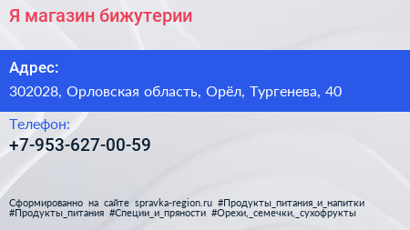 Я, магазин бижутерии по адресу 302028, Орловская область, Орёл, Тургенева, 40 в дальнейшем Организация, размещена в следующих категориях: