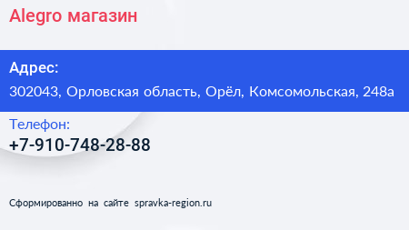 Alegro, магазин по адресу 302043, Орловская область, Орёл, Комсомольская, 248а в дальнейшем Организация, размещена в следующих категориях: