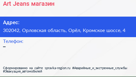 Art Jeans, магазин по адресу 302042, Орловская область, Орёл, Кромское шоссе, 4 в дальнейшем Организация, размещена в следующих категориях: