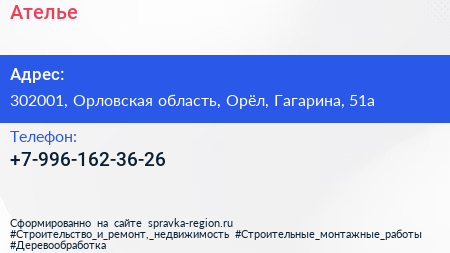 Ателье по адресу 302001, Орловская область, Орёл, Гагарина, 51а в дальнейшем Организация, размещена в следующих категориях:
