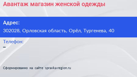 Авантаж, магазин женской одежды по адресу 302028, Орловская область, Орёл, Тургенева, 40 в дальнейшем Организация, размещена в следующих категориях:
