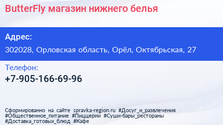 ButterFly, магазин нижнего белья по адресу 302028, Орловская область, Орёл, Октябрьская, 27 в дальнейшем Организация, размещена в следующих категориях: