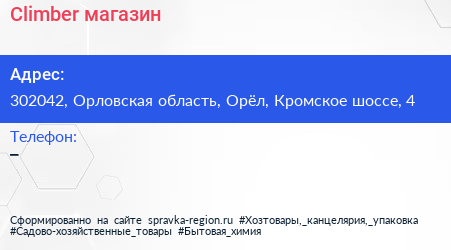 Climber, магазин по адресу 302042, Орловская область, Орёл, Кромское шоссе, 4 в дальнейшем Организация, размещена в следующих категориях: