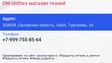 DM clothes, магазин тканей по адресу 302028, Орловская область, Орёл, Тургенева, 16 в дальнейшем Организация, размещена в следующих категориях: