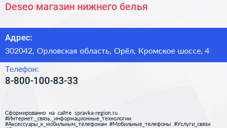 Deseo, магазин нижнего белья по адресу 302042, Орловская область, Орёл, Кромское шоссе, 4 в дальнейшем Организация, размещена в следующих категориях: