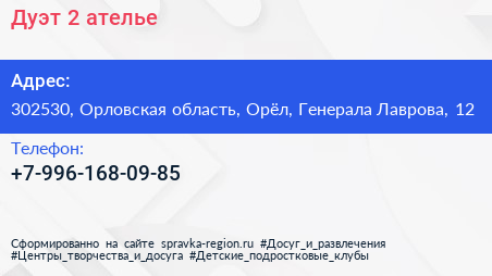 Дуэт 2, ателье по адресу 302530, Орловская область, Орёл, Генерала Лаврова, 12 в дальнейшем Организация, размещена в следующих категориях: