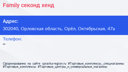 Family, секонд-хенд по адресу 302040, Орловская область, Орёл, Октябрьская, 47а в дальнейшем Организация, размещена в следующих категориях: