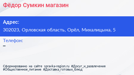 Фёдор Сумкин, магазин по адресу 302023, Орловская область, Орёл, Михалицына, 5 в дальнейшем Организация, размещена в следующих категориях: