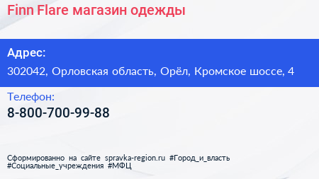 Finn Flare, магазин одежды по адресу 302042, Орловская область, Орёл, Кромское шоссе, 4 в дальнейшем Организация, размещена в следующих категориях:
