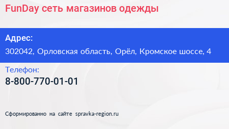 FunDay, сеть магазинов одежды по адресу 302042, Орловская область, Орёл, Кромское шоссе, 4 в дальнейшем Организация, размещена в следующих категориях: