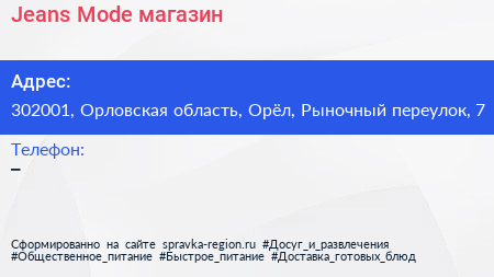 Jeans Mode, магазин по адресу 302001, Орловская область, Орёл, Рыночный переулок, 7 в дальнейшем Организация, размещена в следующих категориях: