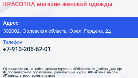 КРАСОТКА, магазин женской одежды по адресу 302002, Орловская область, Орёл, Герцена, 2д в дальнейшем Организация, размещена в следующих категориях: