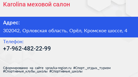 Karolina, меховой салон по адресу 302042, Орловская область, Орёл, Кромское шоссе, 4 в дальнейшем Организация, размещена в следующих категориях: