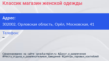 Классик, магазин женской одежды по адресу 302002, Орловская область, Орёл, Московская, 41 в дальнейшем Организация, размещена в следующих категориях: