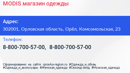 MODIS, магазин одежды по адресу 302001, Орловская область, Орёл, Комсомольская, 23 в дальнейшем Организация, размещена в следующих категориях: