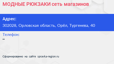 МОДНЫЕ РЮКЗАКИ, сеть магазинов по адресу 302028, Орловская область, Орёл, Тургенева, 40 в дальнейшем Организация, размещена в следующих категориях: