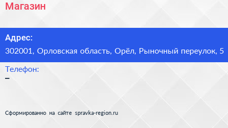 Магазин по адресу 302001, Орловская область, Орёл, Рыночный переулок, 5 в дальнейшем Организация, размещена в следующих категориях: