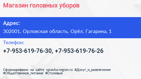 Магазин головных уборов по адресу 302001, Орловская область, Орёл, Гагарина, 1 в дальнейшем Организация, размещена в следующих категориях: