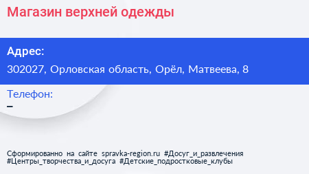 Магазин верхней одежды по адресу 302027, Орловская область, Орёл, Матвеева, 8 в дальнейшем Организация, размещена в следующих категориях: