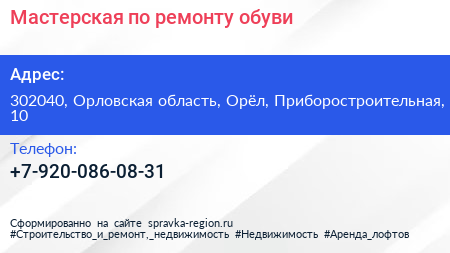 Мастерская по ремонту обуви по адресу 302040, Орловская область, Орёл, Приборостроительная, 10 в дальнейшем Организация, размещена в следующих категориях: