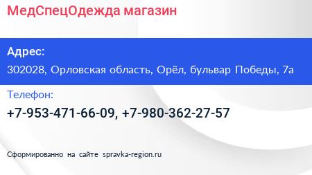 МедСпецОдежда, магазин по адресу 302028, Орловская область, Орёл, бульвар Победы, 7а в дальнейшем Организация, размещена в следующих категориях: