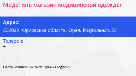 Медстиль, магазин медицинской одежды по адресу 302029, Орловская область, Орёл, Раздольная, 53 в дальнейшем Организация, размещена в следующих категориях: