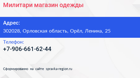 Милитари, магазин одежды по адресу 302028, Орловская область, Орёл, Ленина, 25 в дальнейшем Организация, размещена в следующих категориях: