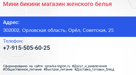 Мини-бикини, магазин женского белья по адресу 302002, Орловская область, Орёл, Советская, 25 в дальнейшем Организация, размещена в следующих категориях: