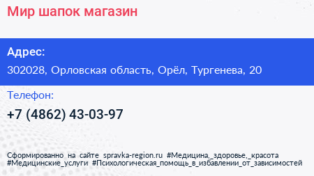 Мир шапок, магазин по адресу 302028, Орловская область, Орёл, Тургенева, 20 в дальнейшем Организация, размещена в следующих категориях: