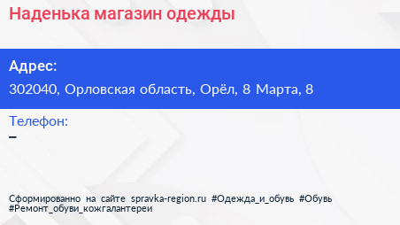 Наденька, магазин одежды по адресу 302040, Орловская область, Орёл, 8 Марта, 8 в дальнейшем Организация, размещена в следующих категориях: