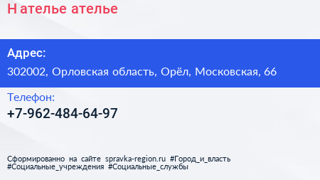 Н`ателье, ателье по адресу 302002, Орловская область, Орёл, Московская, 66 в дальнейшем Организация, размещена в следующих категориях: