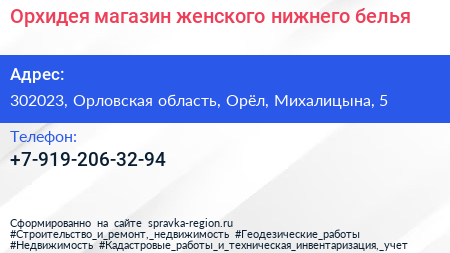 Орхидея, магазин женского нижнего белья по адресу 302023, Орловская область, Орёл, Михалицына, 5 в дальнейшем Организация, размещена в следующих категориях: