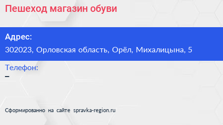 Пешеход, магазин обуви по адресу 302023, Орловская область, Орёл, Михалицына, 5 в дальнейшем Организация, размещена в следующих категориях: