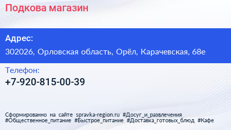 Подкова, магазин по адресу 302026, Орловская область, Орёл, Карачевская, 68е в дальнейшем Организация, размещена в следующих категориях: