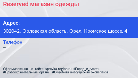 Reserved, магазин одежды по адресу 302042, Орловская область, Орёл, Кромское шоссе, 4 в дальнейшем Организация, размещена в следующих категориях: