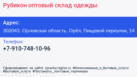 Рубикон, оптовый склад одежды по адресу 302043, Орловская область, Орёл, Пищевой переулок, 14 в дальнейшем Организация, размещена в следующих категориях: