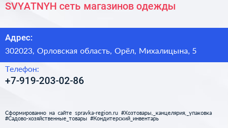 SVYATNYH, сеть магазинов одежды по адресу 302023, Орловская область, Орёл, Михалицына, 5 в дальнейшем Организация, размещена в следующих категориях: