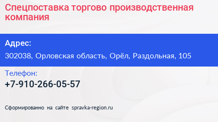 Спецпоставка, торгово-производственная компания по адресу 302038, Орловская область, Орёл, Раздольная, 105 в дальнейшем Организация, размещена в следующих категориях: