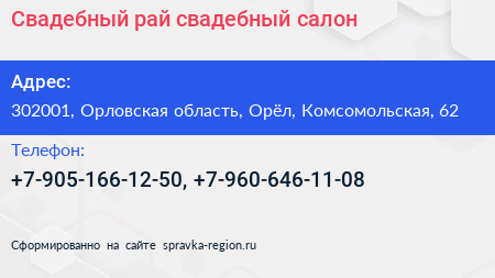 Свадебный рай, свадебный салон по адресу 302001, Орловская область, Орёл, Комсомольская, 62 в дальнейшем Организация, размещена в следующих категориях: