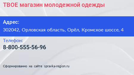 ТВОЕ, магазин молодежной одежды по адресу 302042, Орловская область, Орёл, Кромское шоссе, 4 в дальнейшем Организация, размещена в следующих категориях: