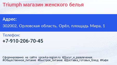 Triumph, магазин женского белья по адресу 302002, Орловская область, Орёл, площадь Мира, 1 в дальнейшем Организация, размещена в следующих категориях: