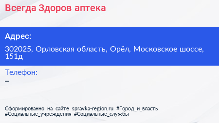 Всегда Здоров, аптека по адресу 302025, Орловская область, Орёл, Московское шоссе, 151д в дальнейшем Организация, размещена в следующих категориях: