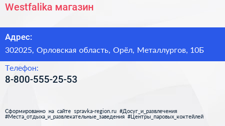 Westfalika, магазин по адресу 302025, Орловская область, Орёл, Металлургов, 10Б в дальнейшем Организация, размещена в следующих категориях: