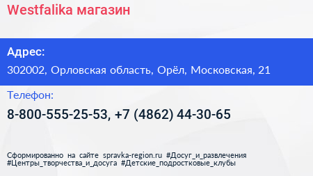 Westfalika, магазин по адресу 302002, Орловская область, Орёл, Московская, 21 в дальнейшем Организация, размещена в следующих категориях: