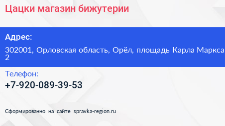 Цацки, магазин бижутерии по адресу 302001, Орловская область, Орёл, площадь Карла Маркса, 2 в дальнейшем Организация, размещена в следующих категориях: