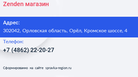 Zenden, магазин по адресу 302042, Орловская область, Орёл, Кромское шоссе, 4 в дальнейшем Организация, размещена в следующих категориях:
